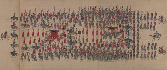 리움에서 최초로 공개하는 작가미상의 '동가반차도(動駕班次圖)' 부분. 고종의 궁궐 밖 행차를 가로 996㎝, 세로 31㎝의 비단에 그린 대작이다.조선 회화사의 주인공인 도화서(圖畵署) 소속 화원들의 작품을 재조명하는 전시다.